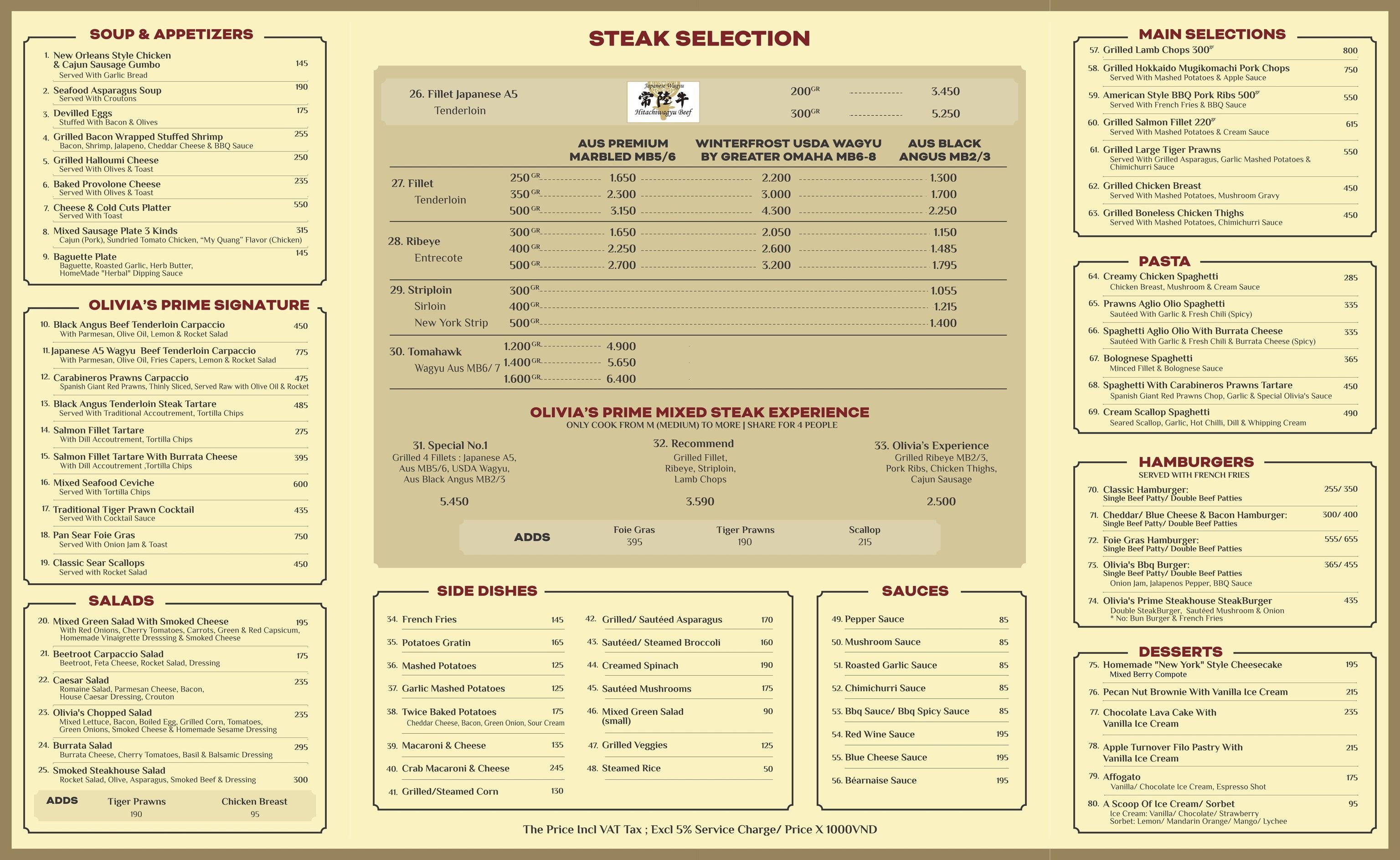 Olivia's Prime Steakhouse Da Nang | Food Menu